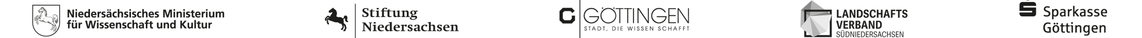 Wir danken unseren Förderern: Niedersächsisches Ministerium für Wissenschaft und Kultur, Stadt Göttingen, Sparkasse Göttingen und Landschaftsverband Südniedersachsen e.V., der Stiftung Niedersachsen, der Niedersächsischen Sparkassenstiftung. Auch bei unseren essentiellen Unterstützern aus dem Ausland möchten wir uns bedanken: dem Institut Français, dem niederländischen Mondriaan Fund und aus Belgien, dem Flanders Culture Fund möchten wir uns herzlich bedanken.